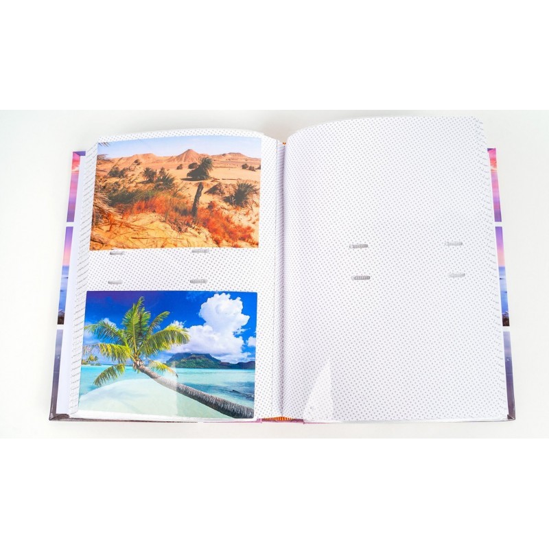 Fotoalbum na 200 fotografií 10x15, šitá kniha, dvě fotografie nad sebou, možnost vlastního popisu u každé fotografie, popiska mezi fotografiemi. Kapsa s popiskovými štítky na zadní straně fotoalba.
