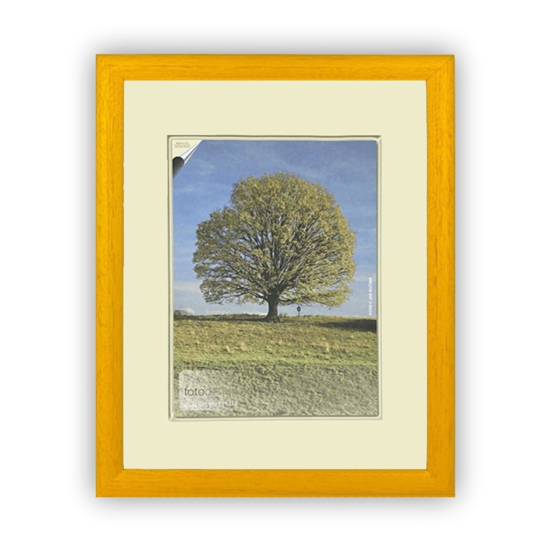 Fotorámeček dřevěny žlutý, pro fotografii do velikosti 28 x 35 cm (s paspartou 18 x 24 cm). Fotorámeček je opatřen háčky na zavěšení. Lze jej zavěsit v poloze na šířku i na výšku. Fotografie je kryta sklem. Velikost rámu je 37,7 x 30,7 cm, lišta 18 x 15 mm.