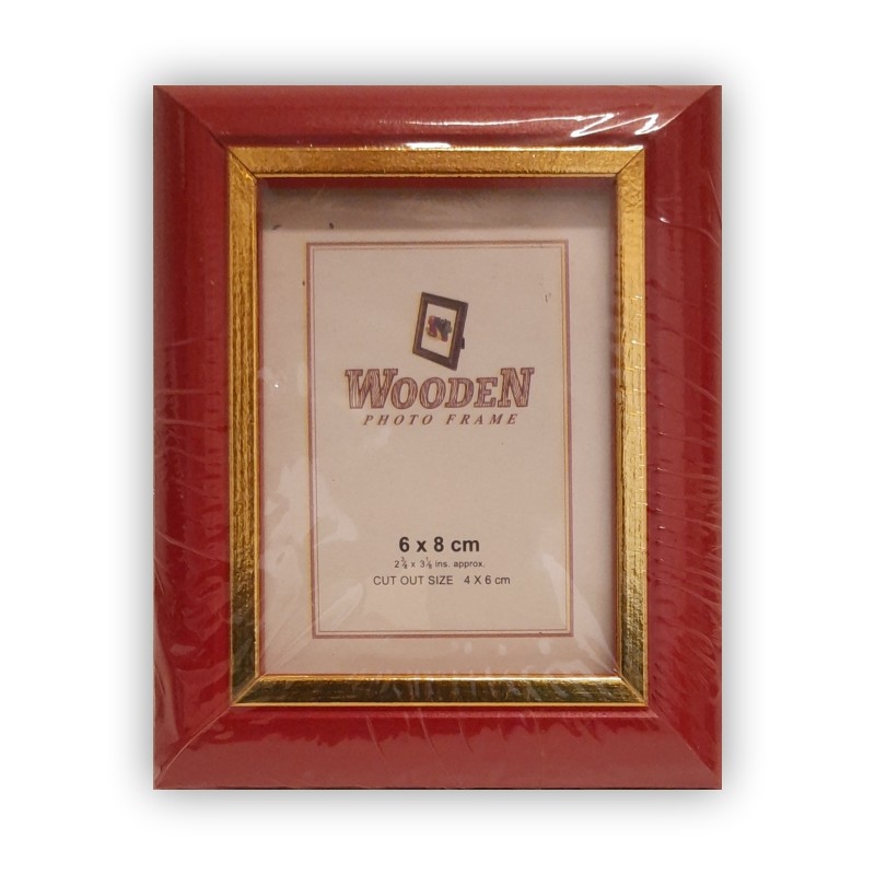 Fotorámeček dřevěny. červený. pro fotografii do velikosti 6 x 8 cm. Fotorámeček je opatřen opěrkou, která umožňuje jeho postavení i háčky na zavěšení. Lze jej postavit nebo zavěsit v poloze na šířku i na výšku. Fotografie je kryta sklem. Velikost rámu je 8,8 x 10,8 cm, lišta 15 x 12 mm.