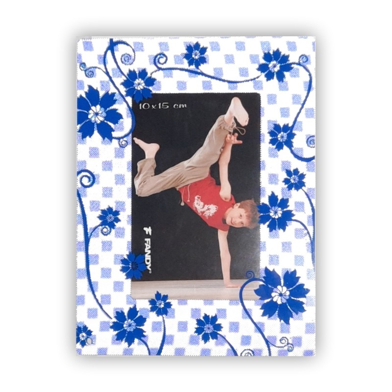 Fotorámeček plastový modrý se čtverečky pro fotografii 10 x 15 cm. Fotorámeček je opatřen opěrkou, která umožňuje jeho postavení. Lze jej postavit v poloze na šířku i na výšku. Fotografie je kryta plastem. Velikost rámu je 16,5 x 21,5 cm.