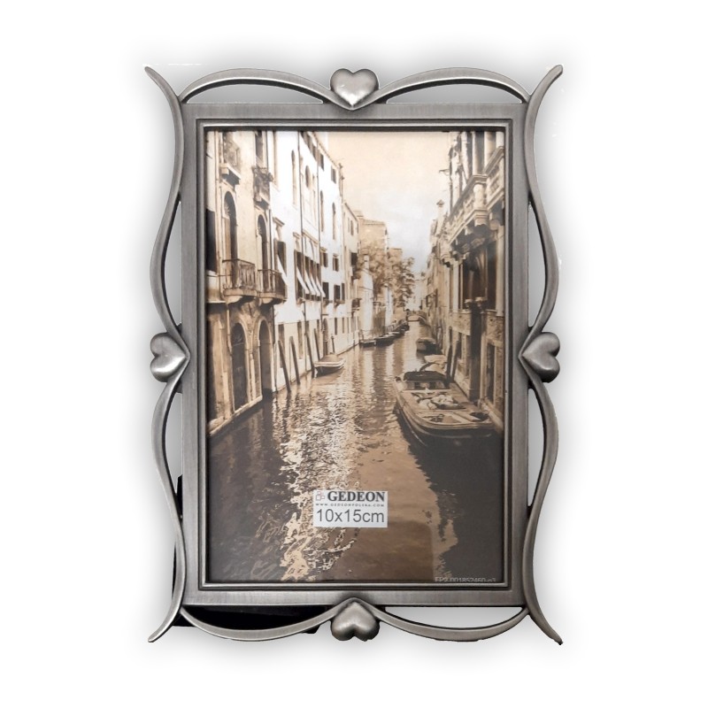 Fotorámeček kovový pro fotografii velikosti (A6) 10 x 15 cm. Fotorámeček je opatřen opěrkou, která umožňuje jeho postavení. Lze jej postavit v poloze na šířku i na výšku. Fotografie je kryta sklem. Velikost rámu je 13,7 x18,7 cm.